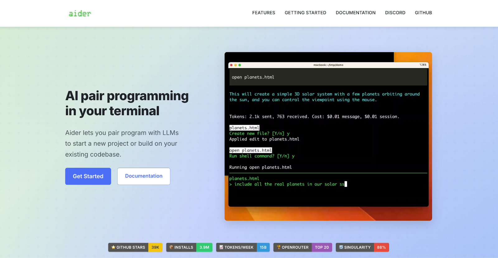 Aider operates entirely in the terminal. It’s an AI assistant for fast text-based workflows powered by Claude, Gemini, or GPT-4 models.
