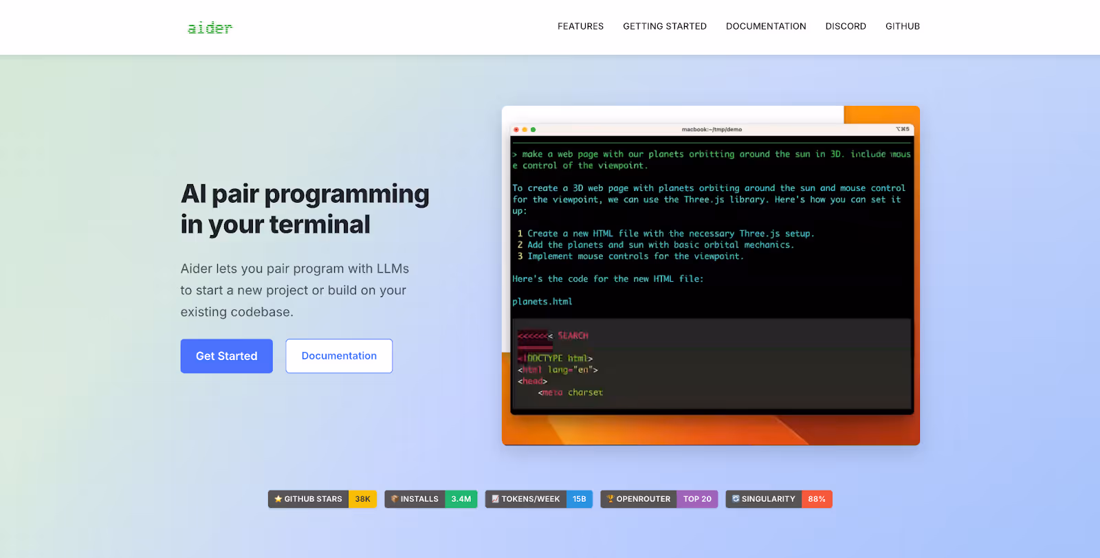 Aider provides free, open-source AI pair programming with support for multiple frameworks and automated debugging workflows.