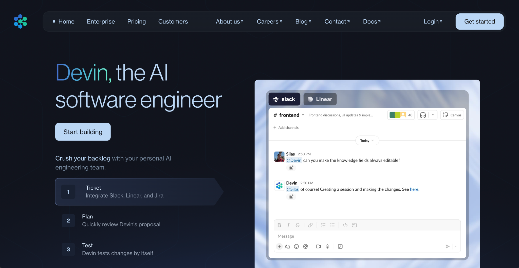 Devin operates as an AI software engineer that joins your existing team to handle engineering tasks autonomously. Rather than being a development environment, Devin integrates with your current workflow through GitHub, Slack, Linear, and Jira to tackle tickets, perform code migrations, and clear backlogs independently.