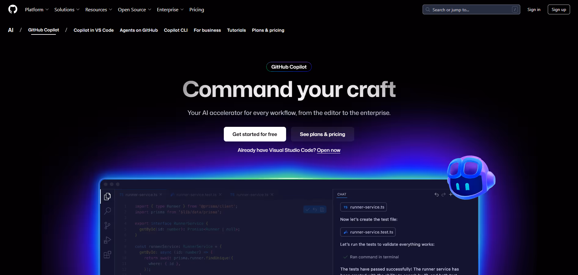 The platform provides sophisticated AI assistance focused on code generation, completion, and optimization within your existing development environment. Powered by OpenAI models and trained on billions of lines of open source code, GitHub Copilot understands programming patterns across multiple languages and frameworks.