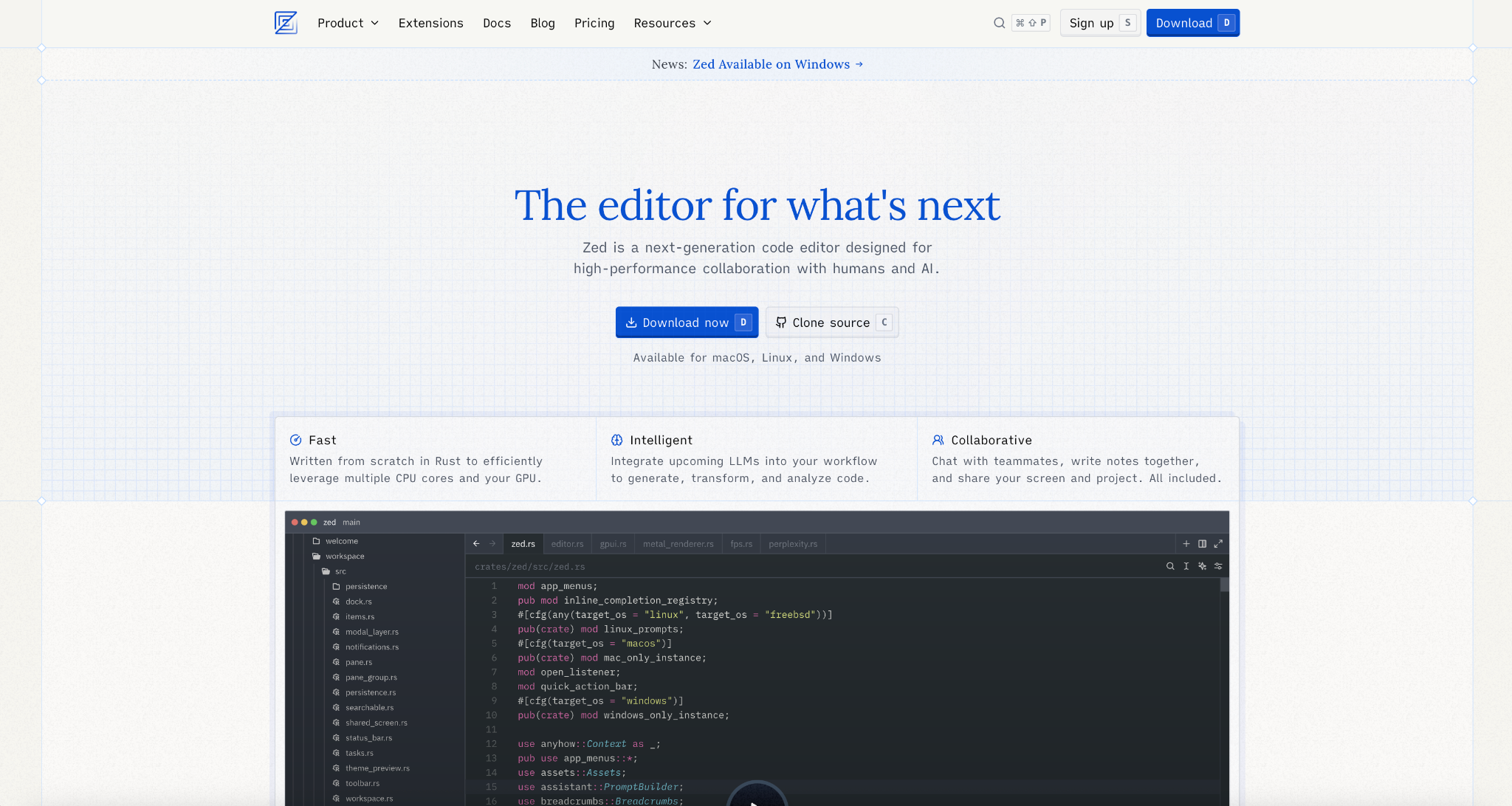 Zed is built in Rust with GPU acceleration, offering 120fps AI-assisted coding with native multiplayer collaboration.