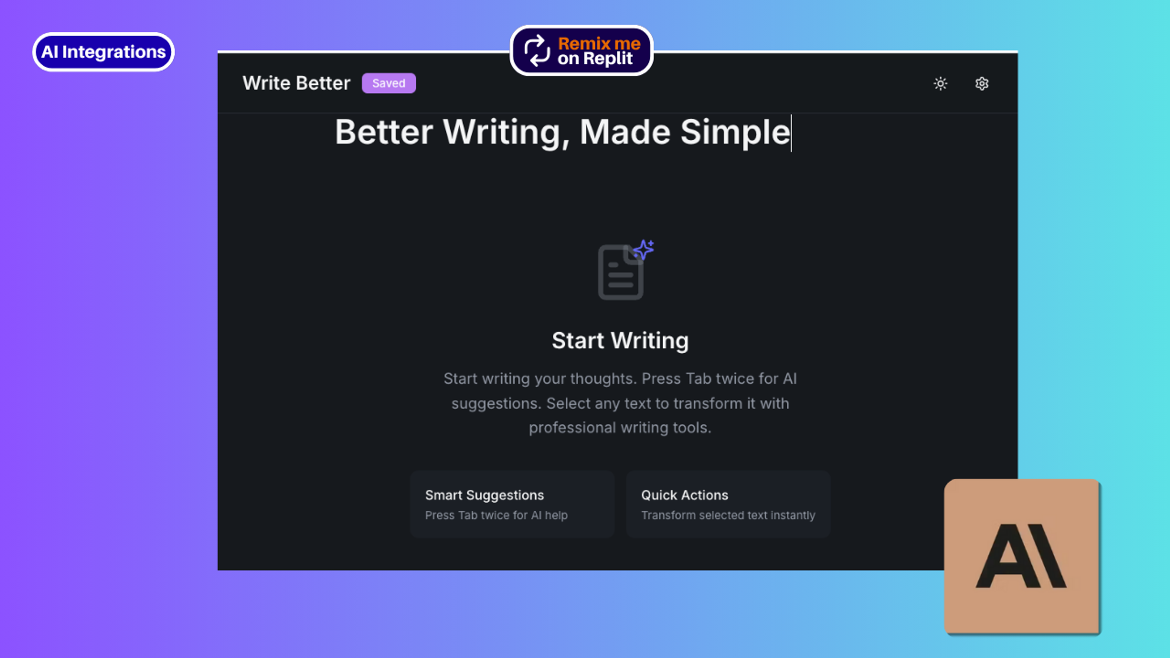 AuraWriter is a distraction-free AI writing assistant that helps you overcome writer's block and improve your content quality. Built with Replit AI Integrations, it leverages Anthropic's Claude models for superior writing assistance. Simply press tab twice to get AI-powered suggestions for your next sentence, highlight text to rewrite in different tones (professional, casual, or expanded), and focus on your ideas while AI handles the polish. Perfect for blog posts, social media content, email drafts, and any writing project where you need intelligent assistance without the complexity.