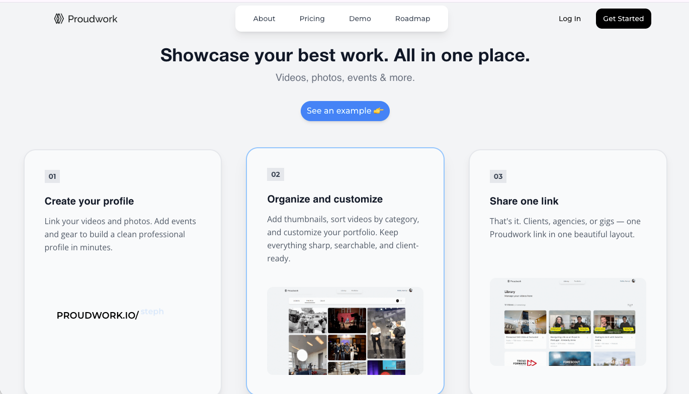 Proudwork.io is a platform for creators to showcase their videos, photos, and gear in a customizable and professional profile, easily sharable via a single link.