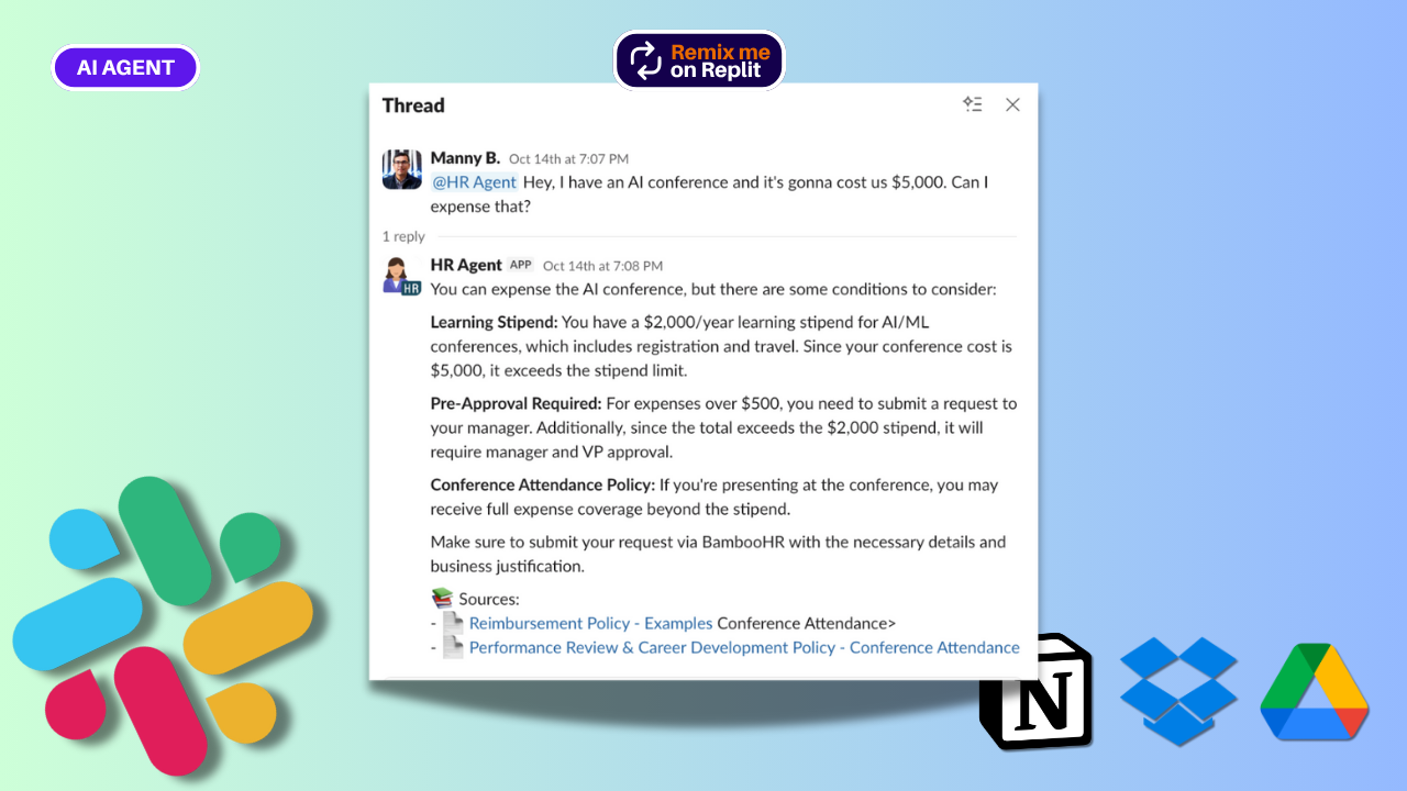 An AI-powered HR agent that lives in your Slack workspace with two superpowers: knowledge and tools. It can answer employee questions by pulling from your HR handbook stored in Dropbox, and take action by creating documents like exit interview templates directly in Google Drive. No more digging through policy docs or waiting for HR to respond—your team gets instant, accurate answers with source citations.