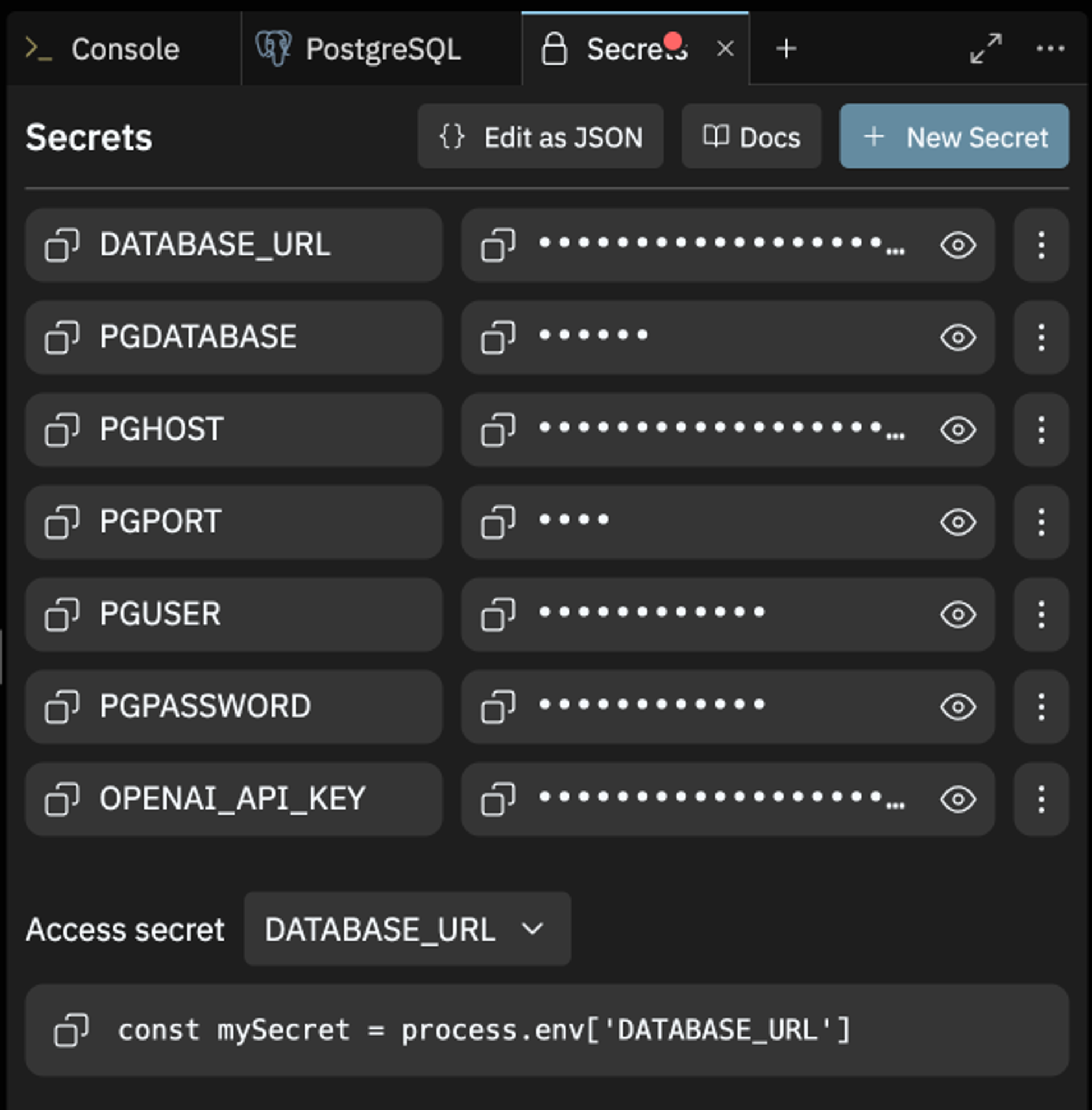 In the environment variables section, you can view all of the relevant connection information about your database. Once provisioned, Replit will automatically port this information to Secrets for usage. (Note: If you don’t see the PG Secrets filled, you may need to close your Secrets tab and reopen it for variables to be ported over.)