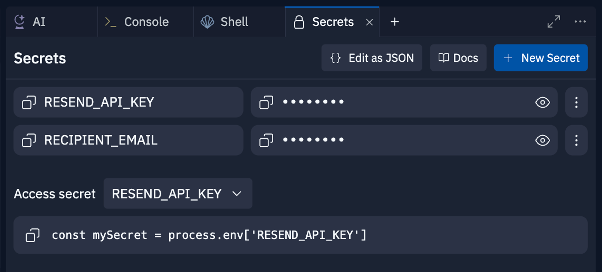 Then paste the API Key into the Secrets tab in your Repl as the secret labeled RESEND_API_KEY. Then add your email to the secret labeled RECIPIENT_EMAIL.