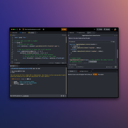 Make Replit your own. You can customize key bindings, configure tabs and panes to your liking, leverage extensions support, and scale your workspace resources to handle projects of all sizes.